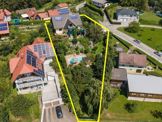 The solidly built house with 440 m2 of living space is slightly elevated at the beginning of a quiet residential area with a view of the large garden laid out on three levels and is completely south-facing. You can take advantage of the perfect sun orientation throughout the day. The house, which has a cold roof, is therefore ideal for expanding the solar and photovoltaic system. The panorama is unobstructed and completely convincing!